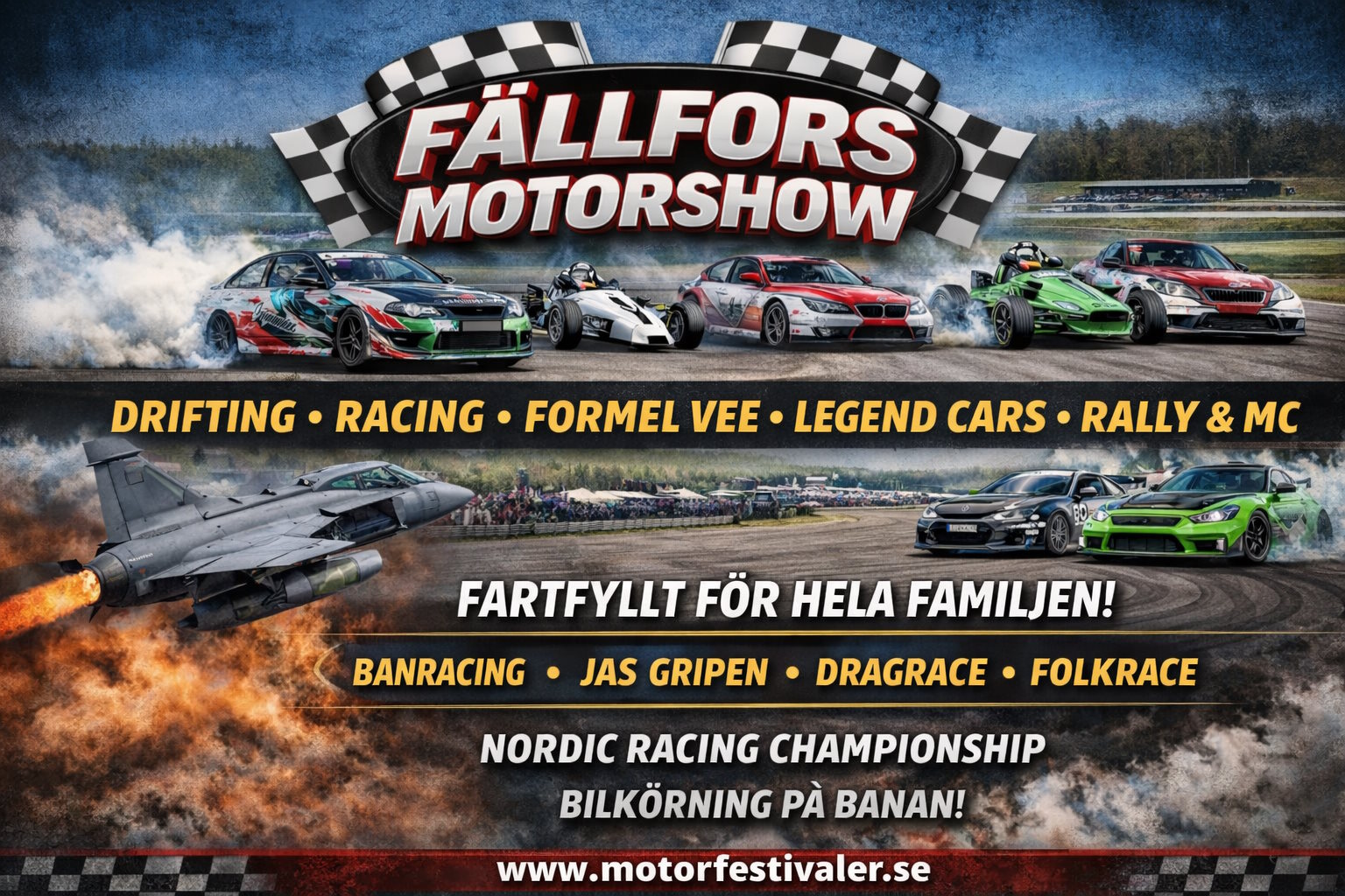 En fantastisk arena som är Sveriges nordligaste racingbanan men även en perfekt plats för Fällfors Motorshow. Det serveras: Drifting, Racingtävling, Publiken får köra på banan, Formel Vee, Legend Cars, Rallybilar, Motorcyklar, Time-Attack mm.